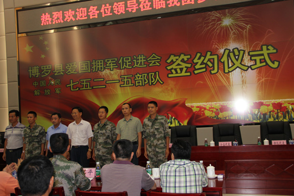 期间,县爱国拥军促进会与75215部队签约,结成“友好连队”,县爱国拥军促进会所属13家企业与75215部队所属25个分队签定合约,结为友好共建单位。罗浮山水泥集团与75215部队70分队(工兵连)结为友好共建单位,并当场为工兵连捐款1万元建篮球场。